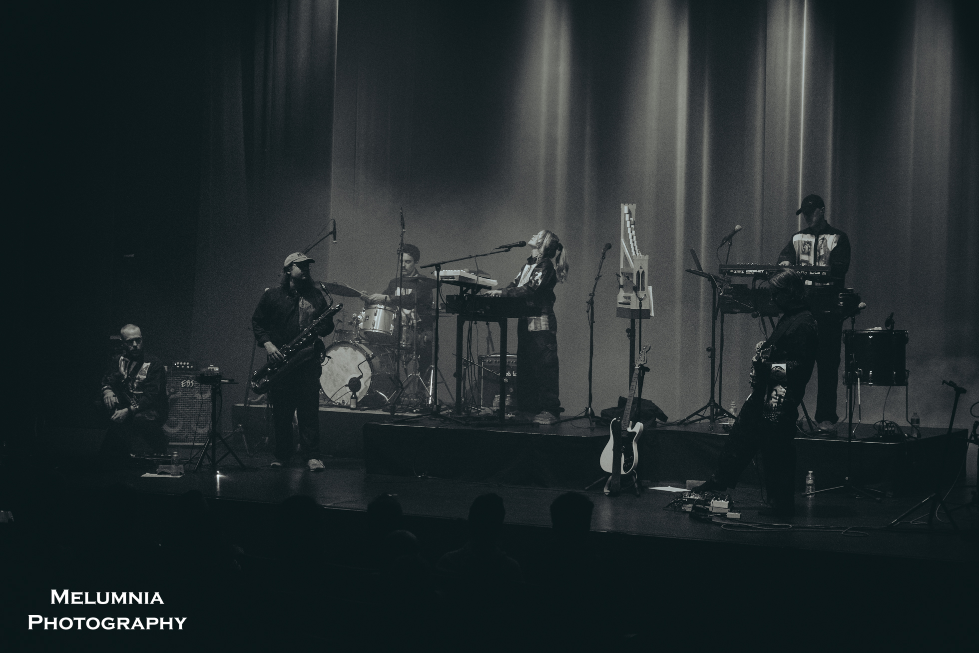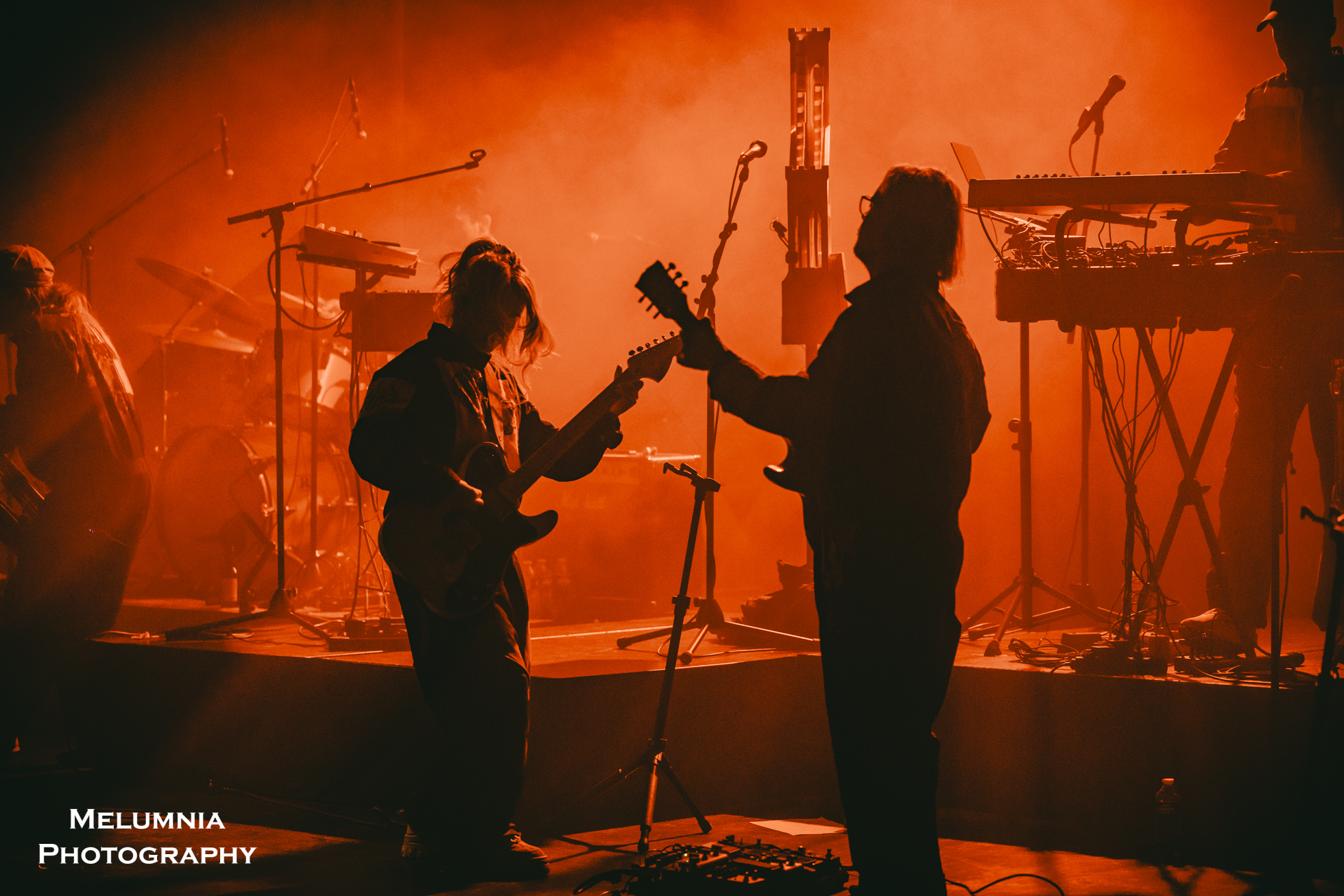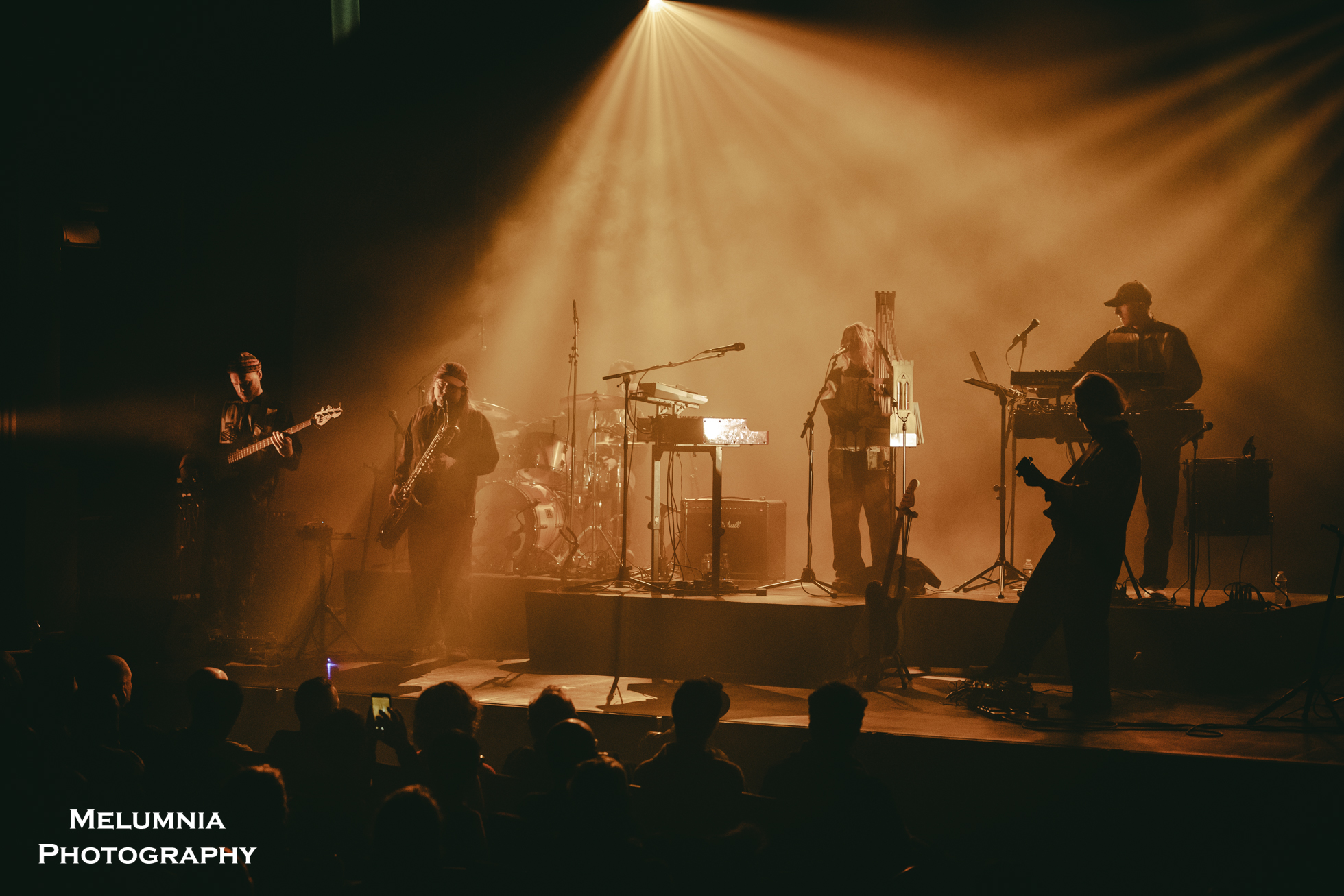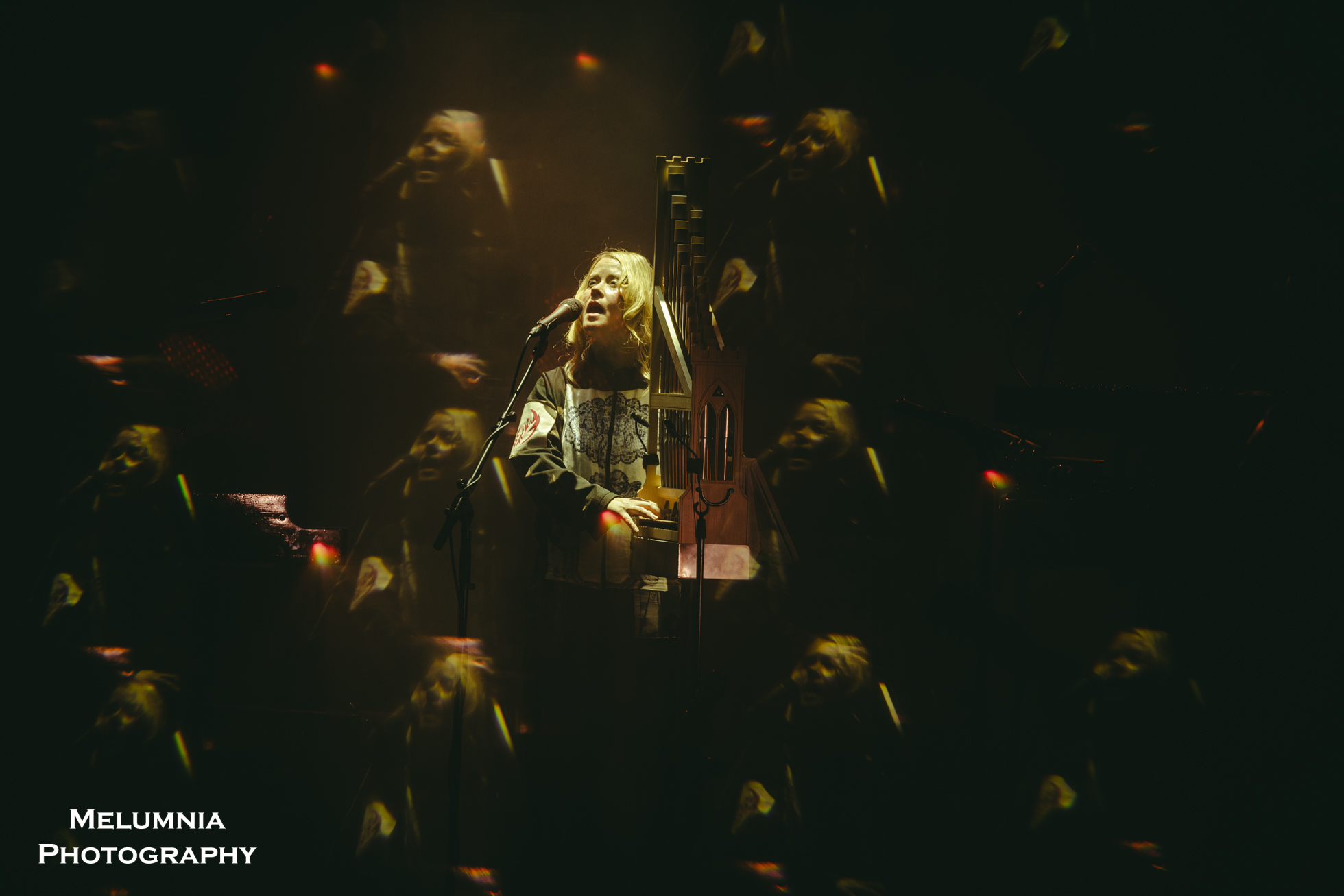 Kaum stand die insgesamt sechs köpfige Band auf der Bühne (alle waren sie in grundsätzlich gleiche Overalls gekleidet), offenbarte sich nicht nur das grossartige Können der einzelnen Bandmitglieder, sondern es zeigte sich auch die hervorragende Idee der Verantwortlichen des Festival Antigel, dieses Konzert im Saal des Alhambra, der in seinen Grundzügen an den Saal im Volkshaus Zürich erinnert, durchzuführen. Bombastische Musik in einem sorgfältig renovierten historischen Kino-/Theatersaal aus dem frühen 20. Jahrhundert ist punkto Akustik und Atmosphäre kaum zu überbieten. Letztere lebte nicht zuletzt auch von der intensiven Lichtshow, die auf Grund der grossen Raumhöhe besonders gut zur Geltung kam und die Bühne mal in ein blutrotes, mal in ein blau-grünes Kleid hüllte. Und dann war da halt immer diese tolle und gut gelaunte Band, die das Letzte aus den Instrumenten herausholte, um den einzigartigen Sound von Anna von Hausswolff zu performen.