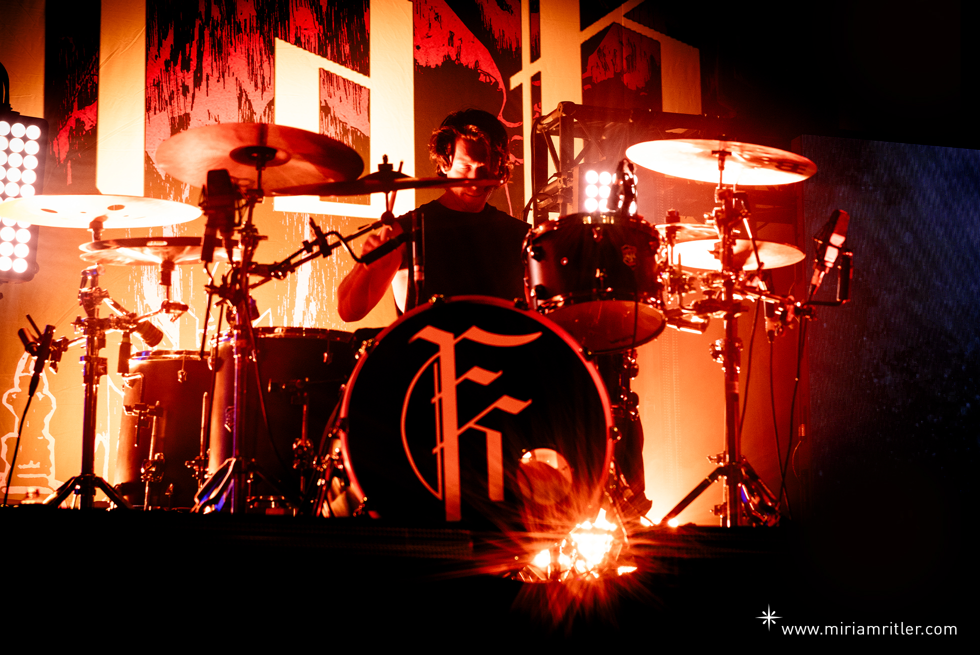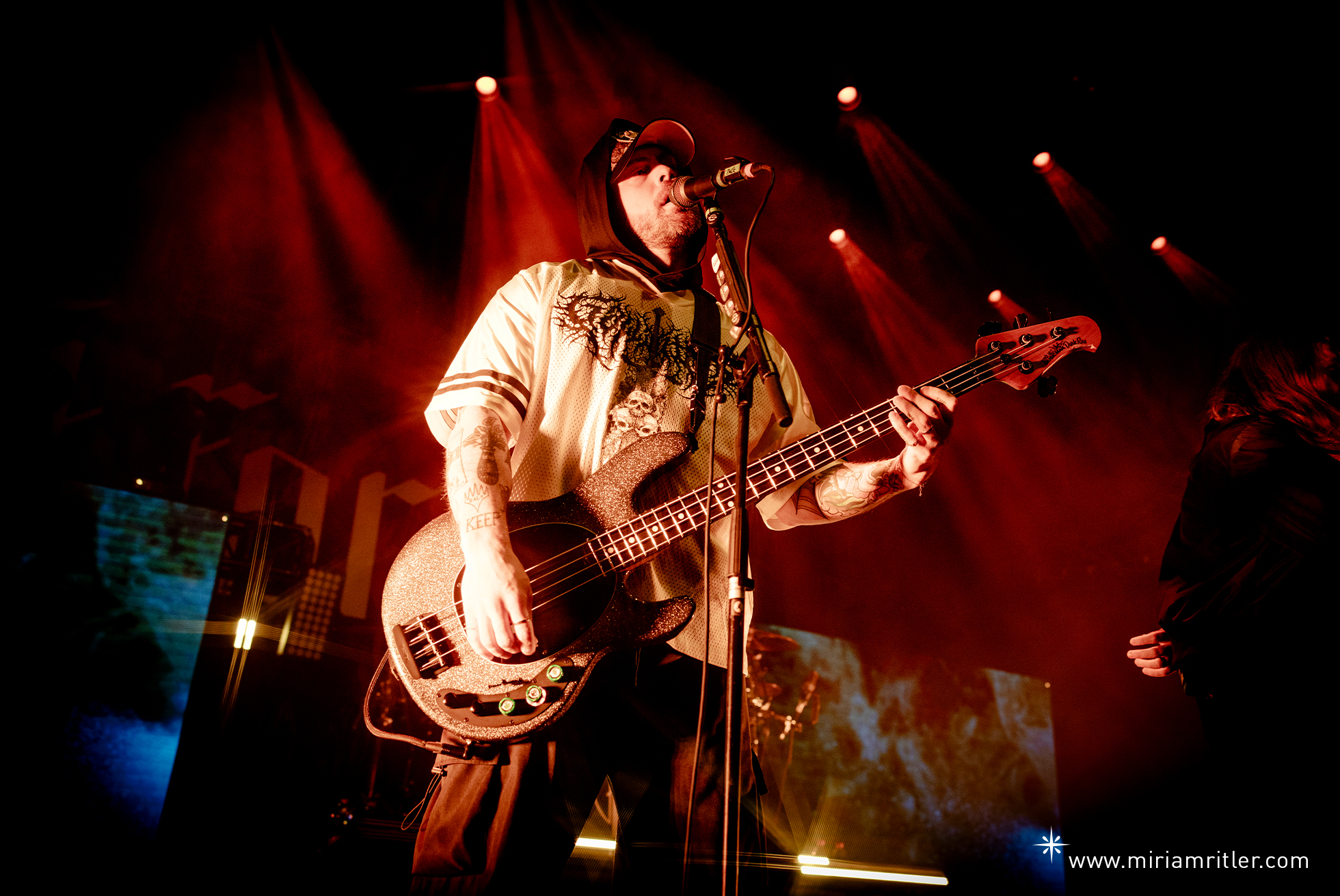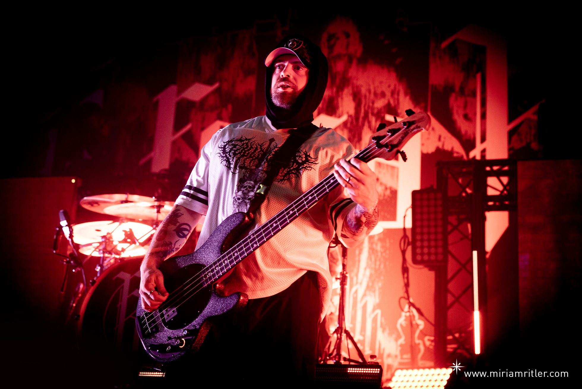 Zum krönenden Abschluss standen Fit For A King auf dem Programm. Ein sichtlich hungriges Publikum erwartete ihren Auftritt. Ein kurzes gesprochenes Intro, begleitet von visuellen Einspielern auf zwei LED-Wänden unterhalb des Drumrisers, leiteten das Set ein. Die Tour trug den Namen ihres aktuellen Albums „Lonely God“, und mit dem Opener des Albums „Begin The Sacrifice“ eröffneten Fit For A King kraftvoll ihren Auftritt . Von Beginn an hatten sie den Saal fest im Griff. Besonders beeindruckend war Sänger Ryan Kirby, der mühelos zwischen ruhigen Clean-Parts und intensiven Growls wechselte und diese teilweise über mehrere Sekunden hinweg hielt. Auch wechselten sich Fit For A King in den Gesangsparts immer mal wieder ab. Ein weiterer Hingucker auf der Bühne waren immer wieder die Einlagen von Bassist Ryan „Tuck“ O’Leary. Drehung um Drehung mit seinem Bass, den er auch mal um den Hals schwang, sowie diverse Sprünge von den Egorisern.