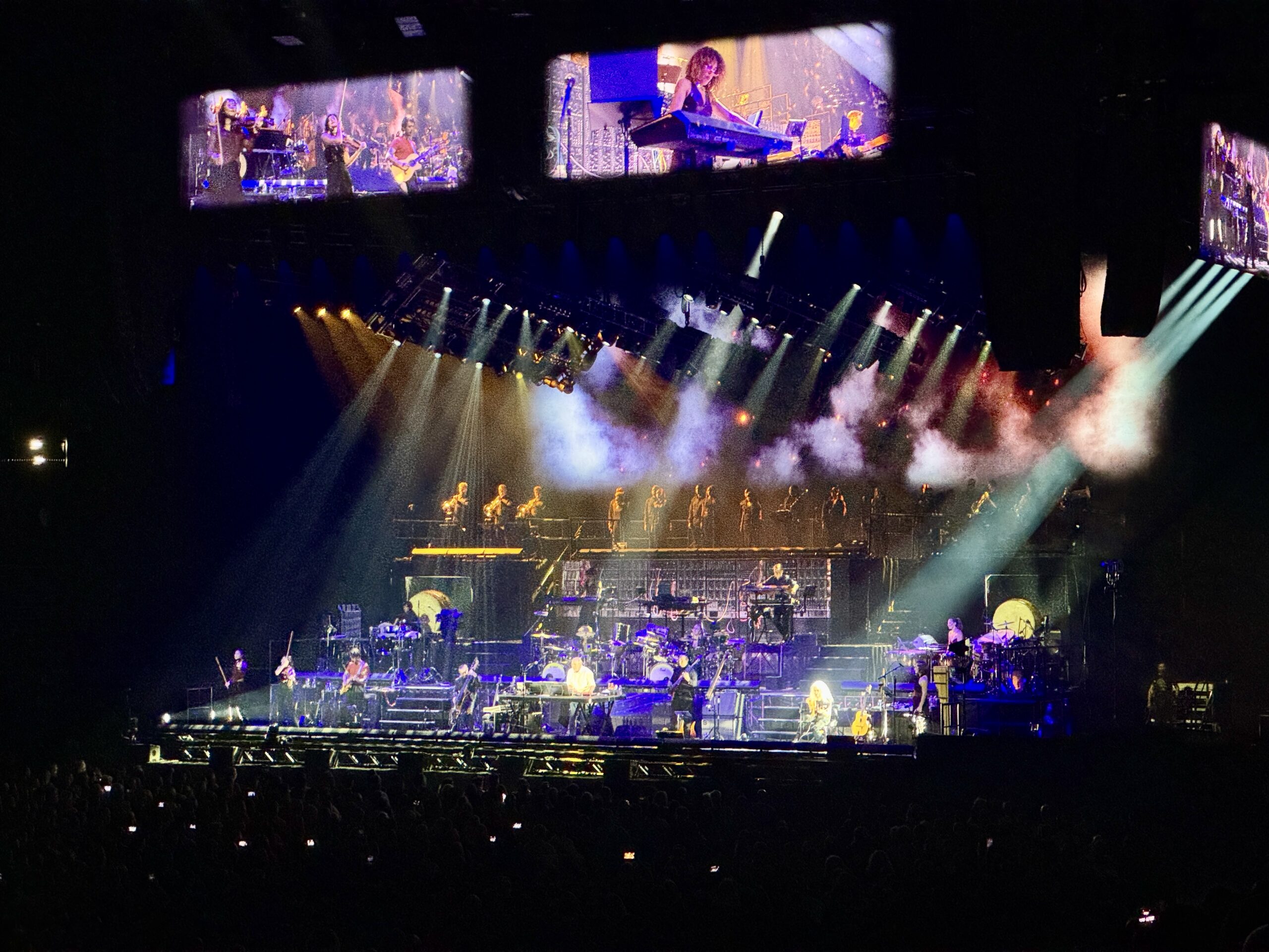 Der Abend stand klar unter dem Motto: weniger Orchester, mehr Band-Charakter! Statt eines klassischen Studio- bzw. Symphonieorchesters versammelte sich auf der Bühne eine gewaltige Formation von mehreren Dutzend Musikerinnen und Musikern, verteilt auf vier Ebenen. Ganz unten dominierten Gitarre, Bass und Saiteninstrumente, eine Ebene darüber erhob sich das mächtige Schlagwerk. Weiter oben folgten Keyboards und Synthesizer und zuoberst fanden Chor und Hörner ihren Platz. Das Resultat: ein Sound, der mit beeindruckender Kraft durch den Saal fegte. Besonders zu Beginn der beiden Konzertteile wurde die Musik vom Schlagwerk vorangetrieben. Gleich zwei komplette Drum-Setups, dazu riesige Taiko-Trommeln und eine Reihe weiterer perkussiver Instrumente sorgten für eine unaufhaltsam pushende Kraft. Das unaufhörliche Gedonner und Gehämmer bei den eher düsteren Songs erzeugte so viel Bewegung und Energie, dass man ein wenig bedauerte, auf den Sitzen bleiben zu müssen. Bei so viel Action wären so einige am liebsten aufgestanden.