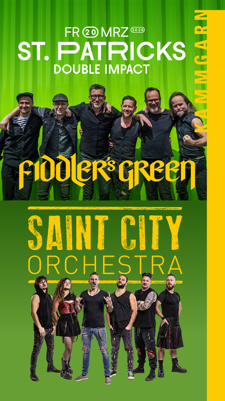 Zum St. Patrick’s Day 2026 bündeln FIDDLER’S GREEN und SAINT CITY ORCHESTRA ihre Kräfte und liefern ein Live-Erlebnis, das nach Schweiss, Bier, grünen Lichtern und purem Adrenalin riecht.